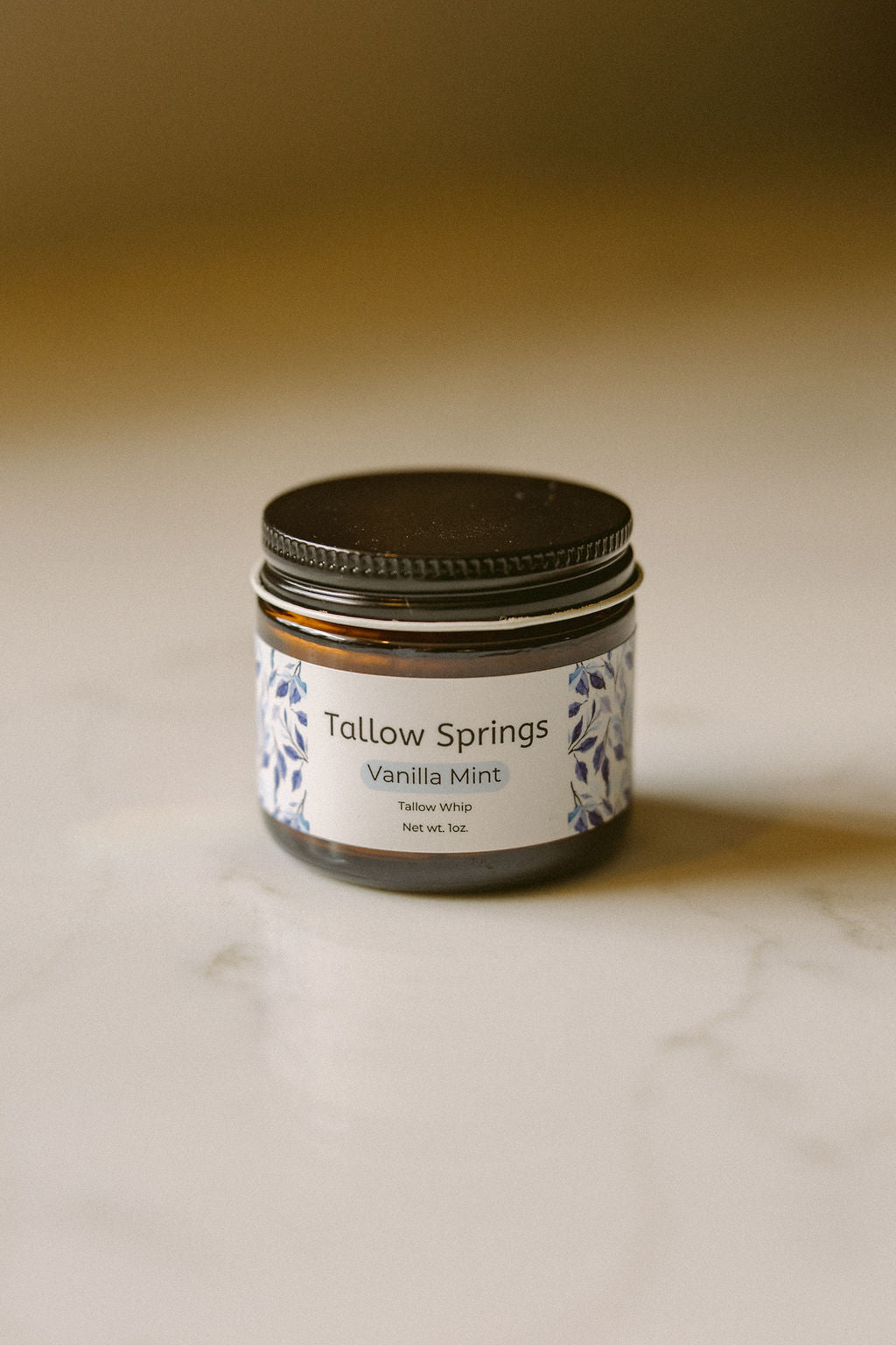 Vanilla Mint Tallow Whip combines the hydrating properties of locally sourced grass fed and finished beef tallow with the refreshing scents of mint and vanilla. Tallow helps to restore and lock in moisture, leaving your skin soft and smooth.